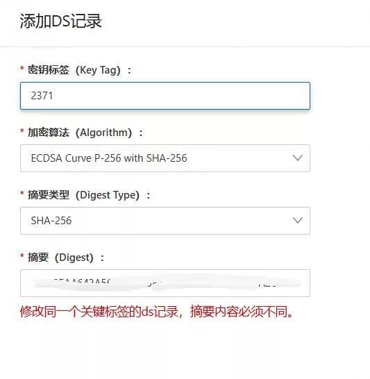 然后就突然想到DNSSEC,一查发现,果然是之前配置错了,阿里云把加密算法前面的序号删掉了....所以CF那边写的 算法 13 ,就是对应 ECDSA Curve P-256 with SHA-256 这个选项。