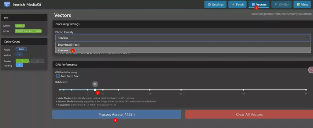第二步 在Vectors,Quality选择Preview,然后根据自己GPU性能可以选择Batch Size,最后执行Process Assets,开始对内容数据计算并标签