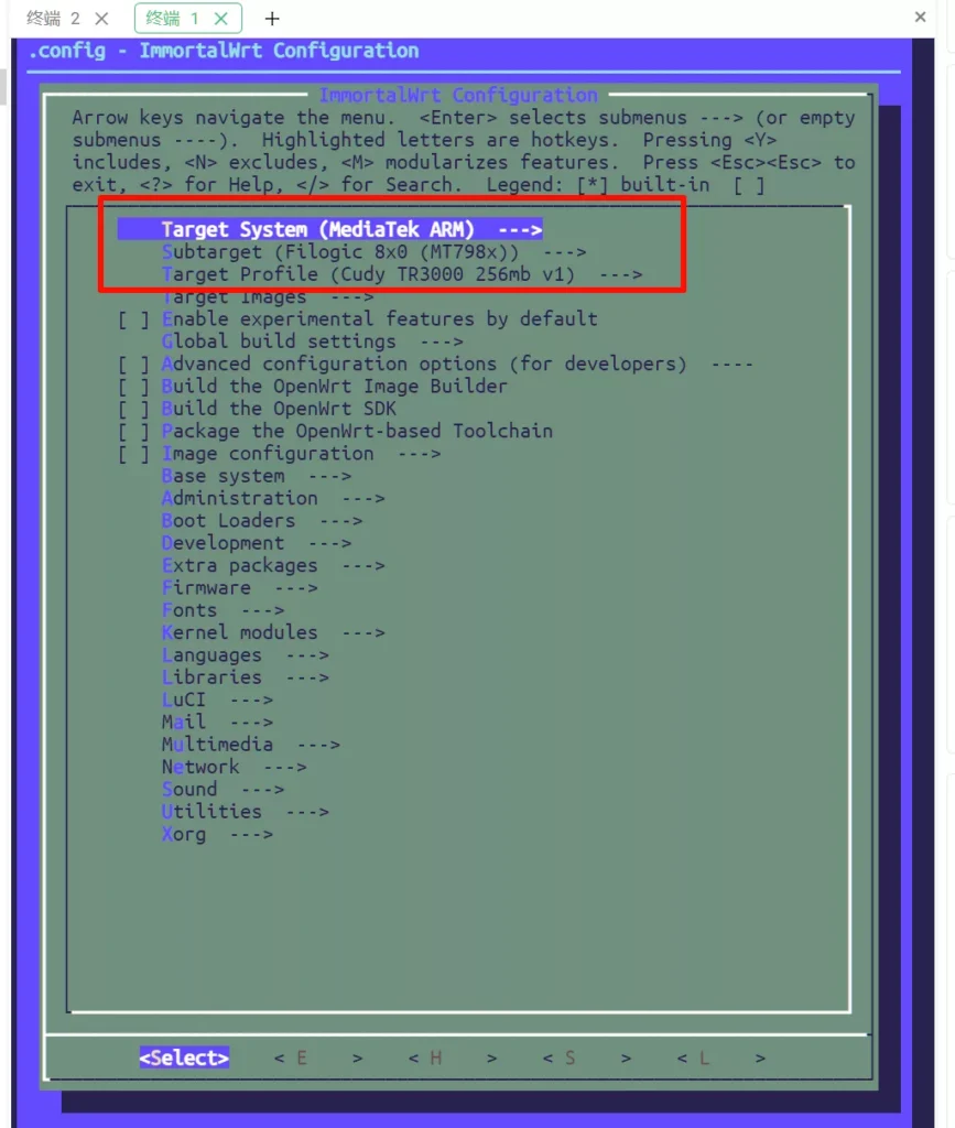 前三项如图所示,即为Cudy TR3000 256M v1的固件选项,注意 空格是选择,双击esc是返回上一页