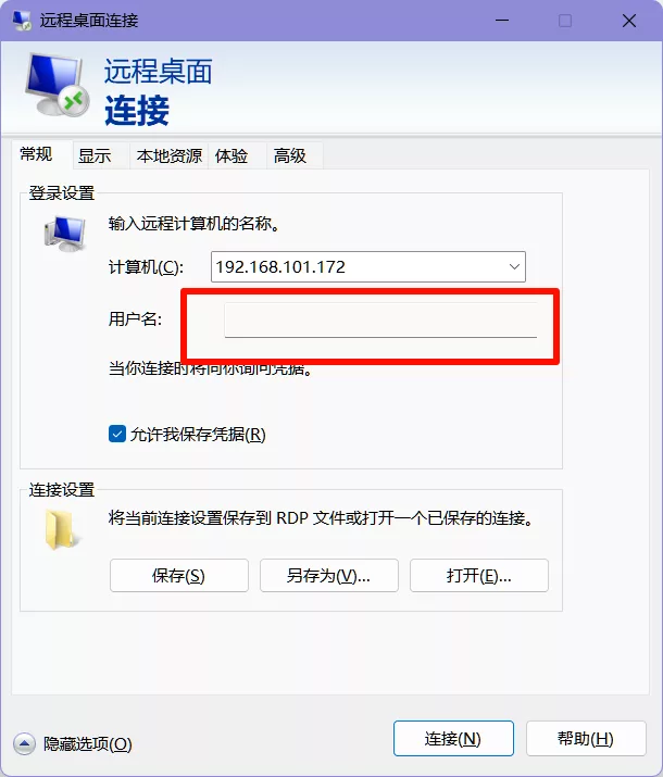 输入主机的IP、用户名、勾选 允许我保存凭据,然后输入密码后即可进入